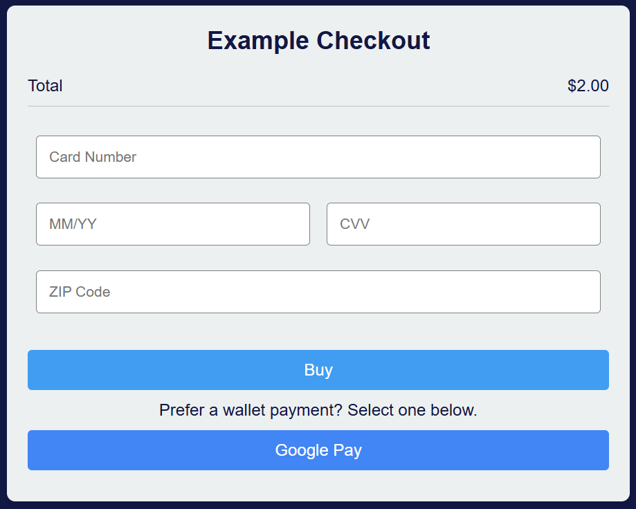 // Code Example const walletPayment = { amount: 5000, // Transaction amount in cents ($50.00) onTokenReceived: function(token) { console.log("Card Token:", token); // Perform further actions with the token here }, onWindowOpened: function() { console.log("Payment window opened."); // You can prompt the user to continue in the opened payment window }, onWindowClosed: function() { console.log("Payment window closed."); // Handle cleanup or retry logic here }, windowWidth: 400, windowHeight: 300, html: "<div id='google-pay-placeholder'></div><div id='apple-pay-placeholder'></div>", css: "div { text-align: center; }" };