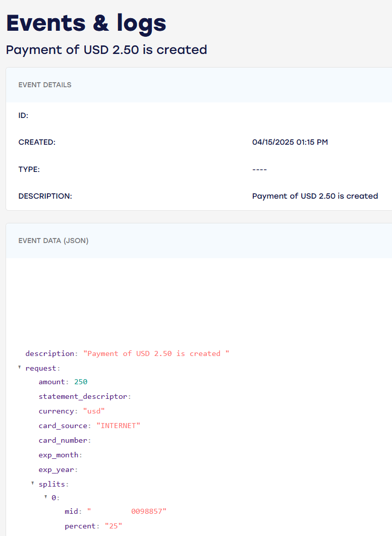- The charge, along with its split instruction, is recorded in the Merchant’s Events & Logs: